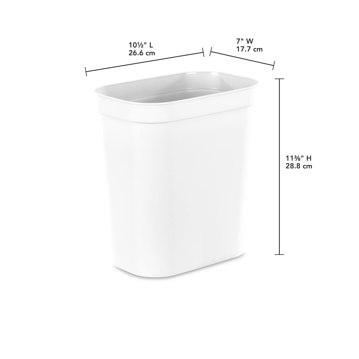 - Dimensions & Size: This small wastebasket has outside dimensions of 10 1/2" x 7" x 11 3/8" and is designed to fit a standard size plastic shopping bag.